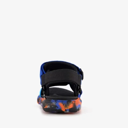 Blauwe Blue Box sandalen met oranje details voor jongens. Het boven- en binnenwerk zijn gemaakt van textiel en de stevige profielzool is van rubber. De sandalen hebben klittenbandsluitingen bij de tenen en de enkel voor een makkelijke instap.