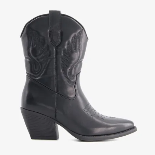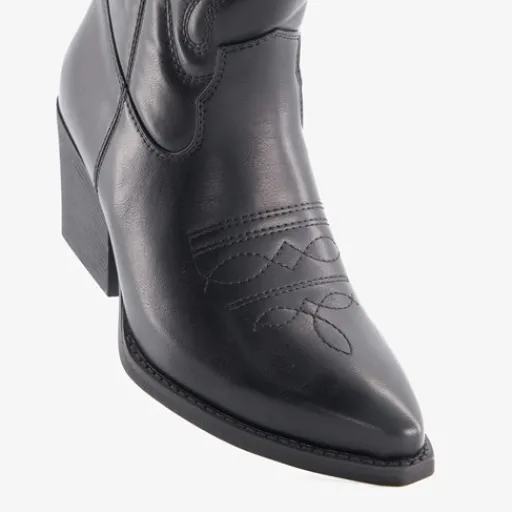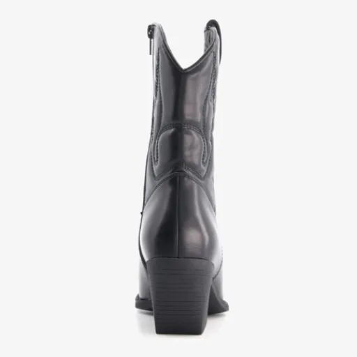 Zwarte western boots voor dames uit de Blue Box collectie. Het buitenwerk is gemaakt van imitatieleer, het binnenwerk van textiel en de buitenzool is van rubber. Voorzien van een ritssluiting aan de binnenzijde en aantreklusjes de bovenzijde. De boots hebben een blokhak van circa 5 cm en een schachthoogte van 21 cm. Binnenzool is niet uitneembaar.