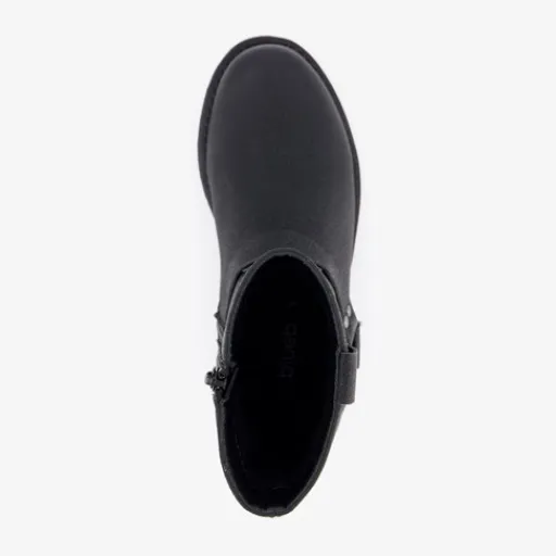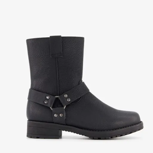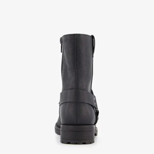 Zwarte biker boots voor meisjes van Blue Box. Met een boven- en binnenwerk van imitatieleer en een rubberen zool. De boots hebben een ritssluiting aan de binnenzijde en een vast voetbed van textiel. Voorzien van een decoratieve gesp. De boots hebben een schachthoogte van 15 cm.