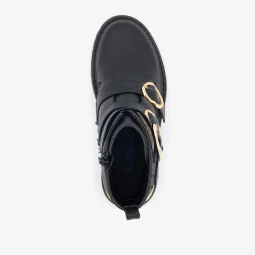 Zwarte enkellaarsjes met goudkleurige gespen in de vorm van hartjes van Blue Box. Het buiten- en binnenwerk zijn gemaakt van imitatieleer, en de stevige zool met profiel is van rubber. De laarsjes zijn voorzien van een ritssluiting en bandjes met gespsluitingen aan de buitenzijde voor een optimale pasvorm. Ze hebben hiellusjes voor een makkelijke instap en een schachthoogte van 11 cm. De binnenzool is niet uitneembaar.