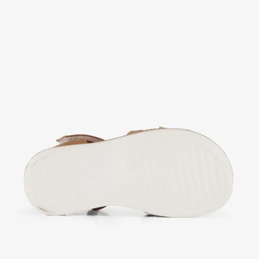 Bruine sandalen met goudkleurige details voor meisjes uit de Blue Box collectie. Gemaakt van imitatieleer met een witte profielzool van rubber. De sandalen hebben een klittenbandsluiting bij de enkel en meerdere banden over de tenen. Binnenzool is niet uitneembaar.