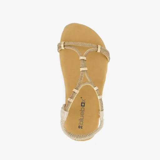 Goudkleurige meisjes sandalen van Blue Box. Gemaakt van imitatieleer met een stevige profielzool van rubber. Voorzien van elastische bandjes bij de enkels voor een makkelijke instap. Deze leuke meisjes sandalen worden versierd met goudkleurige strass steentjes en ringen om de banden heen.