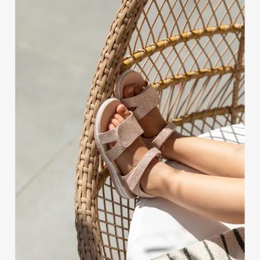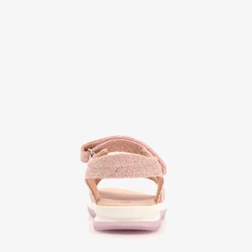 Roze glitter sandalen voor meisjes. Met een boven- en binnenwerk van imitatieleer en een rubberen zool. De sandalen hebben klittenbandsluitingen op de wreef en tenen en een comfortabel voetbed van imitatieleer. Op het bovenwerk zijn glitters aangebracht.