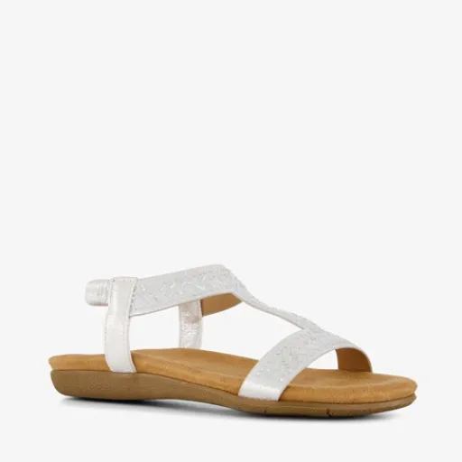 Zilverkleurige sandalen met strass steentjes voor meisjes. Gemaakt van imitatieleer en met een stevige zool van rubber. De sandalen hebben een elastische bandje bij de enkel voor een makkelijke instap en een comfortabele binnenzool van textiel. Deze is niet uitneembaar.