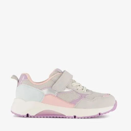 Grijze meisjes sneakers met pastel roze en pastel paarse accenten van Blue Box. Het buitenwerk is gemaakt van imitatieleer, het binnenwerk van textiel en de stevige zool met profiel is van rubber. De sneakers hebben elastische veters met klittenbandsluiting en een hiellusje voor een makkelijke instap. Het comfortabele voetbed van textiel is uitneembaar.