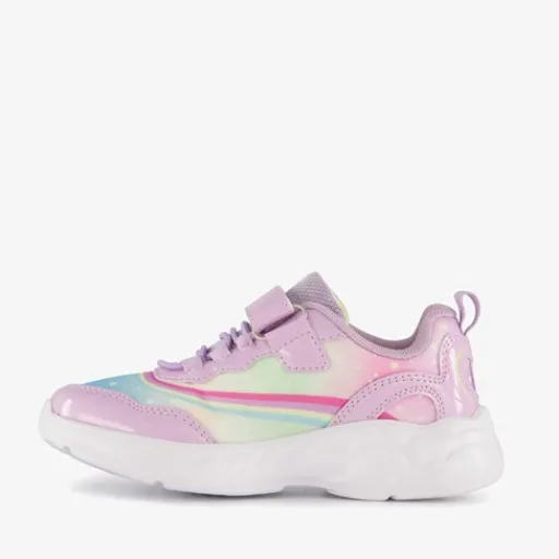 Paarse meisjes sneakers met regenbogen, hartjes met glitters en lichtjes in de zolen. Het buitenwerk is gemaakt van imitatieleer, het binnenwerk van textiel en de stevige zool met profiel is van rubber. De sneakers zijn voorzien van elastische veters en een klittenbandsluiting voor een optimale pasvorm en hiellusjes voor een makkelijke instap. Het comfortabele voetbed van textiel is uitneembaar. De lichtjes in de zolen gaan aan wanneer er op de schoenen wordt gelopen, deze zijn niet oplaadbaar.
