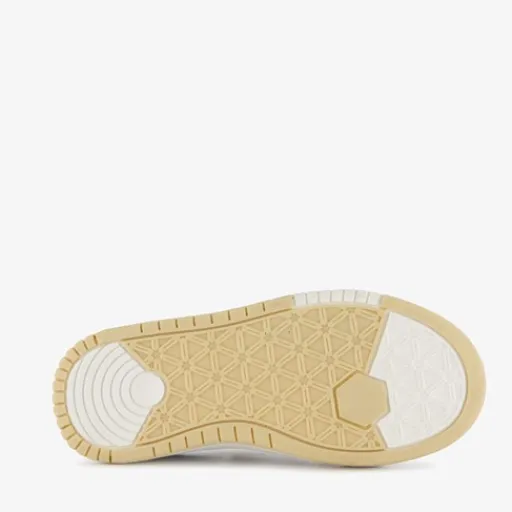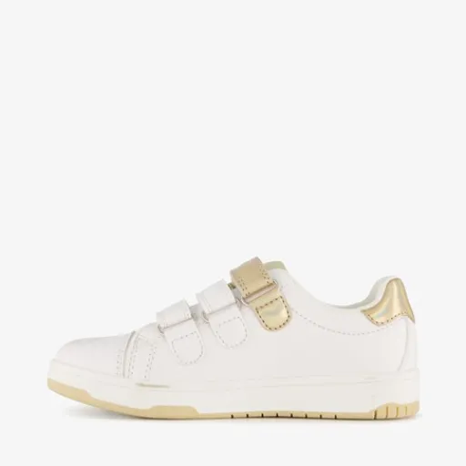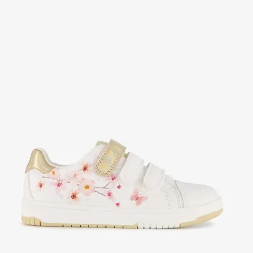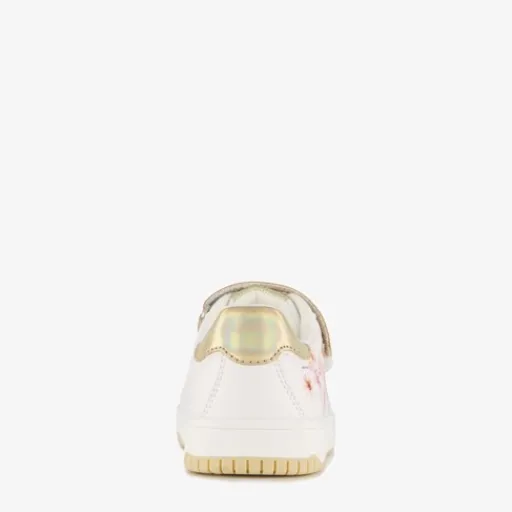 Witte meisjes sneakers met bloemen en gouden details. Het buitenwerks is gemaakt van imitatieleer, het binnenwerk van textiel en de stevige zool met profiel. Voorzien van een klittenbandsluiting en een comfortabele binnenzool van textiel. Deze is niet uitneembaar.