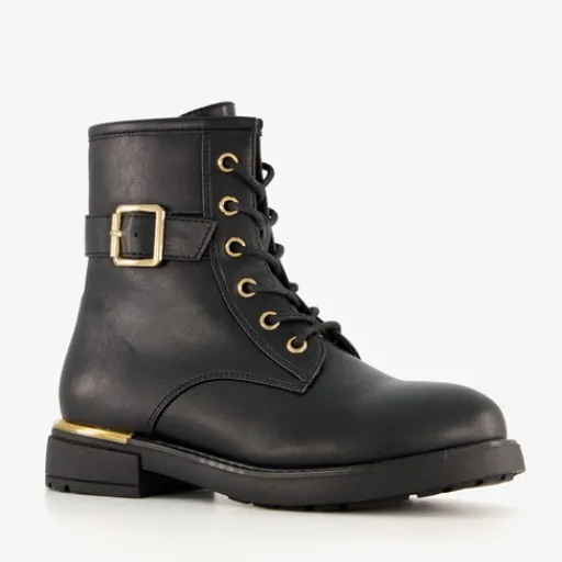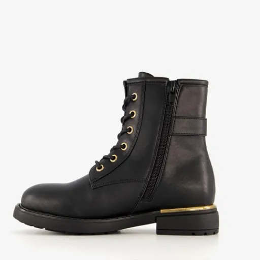 Zwarte veterboots voor meisjes. Gemaakt van imitatieleer, een binnenwerk van textiel en een rubberen zool. De boots hebben een vetersluiting en rits aan de binnenzijde. Het vaste voetbed is gemaakt van textiel. Voorzien van een goudkleurige gesp en een schachthoogte van 13 cm.