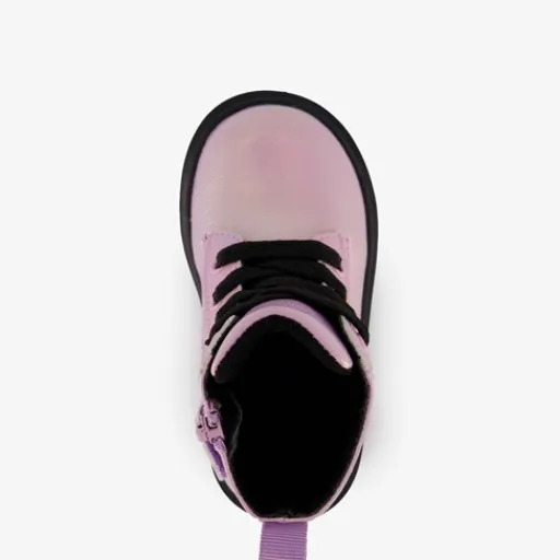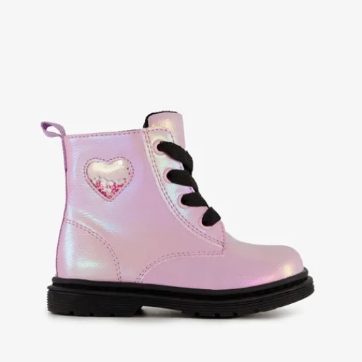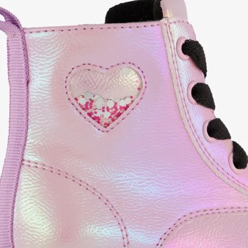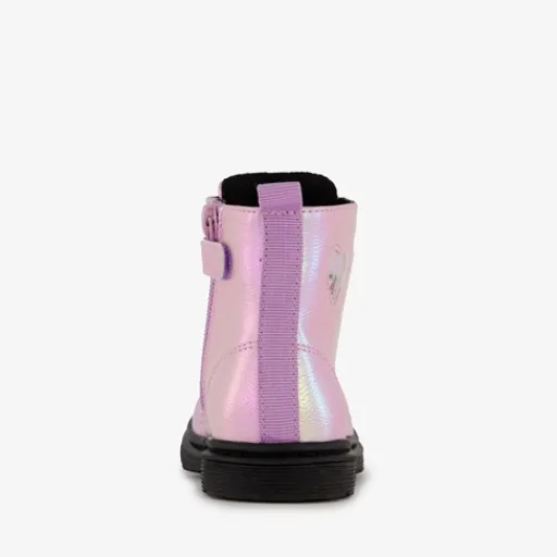Paars veterboots voor meisjes van Blue Box. Gemaakt van imitatieleer, een binnenwerk van textiel en een rubberen zool. De boots hebben een vetersluiting en rits met klittenbandje aan de binnenzijde. Het comfortabele voetbed is gemaakt van textiel. Deze is uitneembaar. De laarsjes hebben een hartje met confetti op het buitenwerk. Schachthoogte is 9 cm.