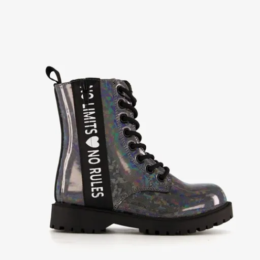 Zwarte, metallic veterboots met glitters voor meisjes uit de Blue Box collectie. Gemaakt van imitatieleer met een binnenwerk van textiel en een stevige profielzool van rubber. Voorzien van een vetersluiting en een ritssluiting aan de binnenzijde voor een optimale pasvorm. Aan de buitenzijde hebben de laarsjes een sierrits met een strook met een witte tekstopdruk. De boots hebben een vast voetbed van textiel en hiellusjes voor een makkelijke instap. Schachthoogte is 13 cm.