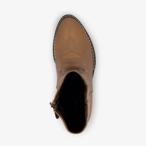 Bronskleurige western laarsjes van Blue Box. Gemaakt van imitatieleer, een binnenwerk van textiel en een rubberen zool. De cowboylaarsjes hebben een ritssluiting met klittenbandje aan de binnenzijde en een vast voetbed van textiel. De schachthoogte bedraagt 11 cm. De western laarsjes hebben een lage hak van circa 3,5 cm.