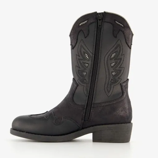 Zwarte western laarsjes van Blue Box. Deze halfhoge laarsjes hebben een buitenwerk van imitatieleer, een binnenwerk van textiel en een stevige zool met een laag hakje. Deze stijlvolle boots zijn voorzien van verschillende details op het buitenwerk en een rits aan de binnenzijde. Bovenaan de schacht voorzien van een aantreklusje. De schachthoogte is circa 16 cm.