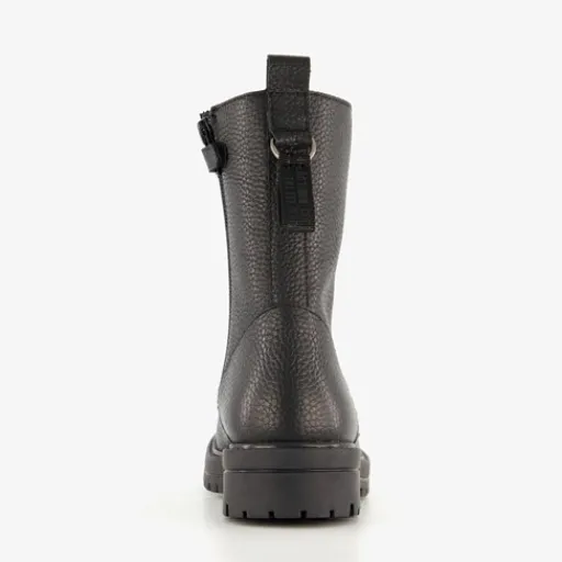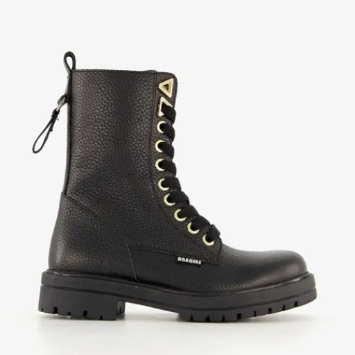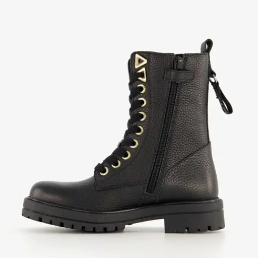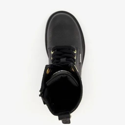 Stoere, zwarte veterboots voor meisjes van Braqeez. Het buitenwerk is gemaakt van leer, het binnenwerk van imitatieleer en de stevige zool met profiel van rubber. Voorzien van een veter- en ritssluiting met een klittenbandje voor een optimale pasvorm en aantreklusjes aan de achterkant voor een makkelijke instap. De boots worden versierd met goudkleurige details en hebben een comfortabele voetbed van leer. Deze is uitneembaar. Schachthoogte is 16 cm en hakhoogte is circa 1 cm.
