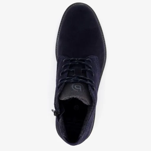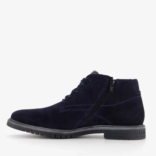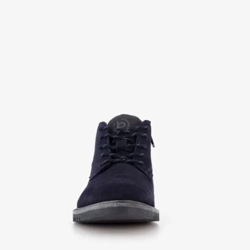 Hoge, donkerblauwe veterschoenen voor heren uit de Bugatti collectie. Gemaakt van suede, een binnenwerk van leer en een stevige zool. De nette schoenen hebben een vetersluiting en vast voetbed van textiel.
