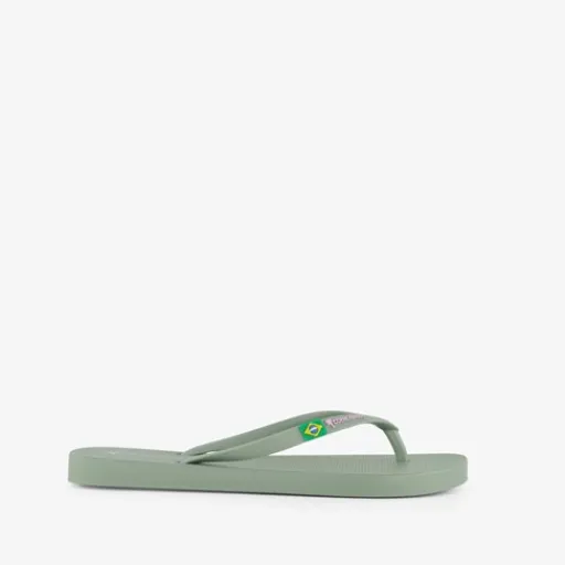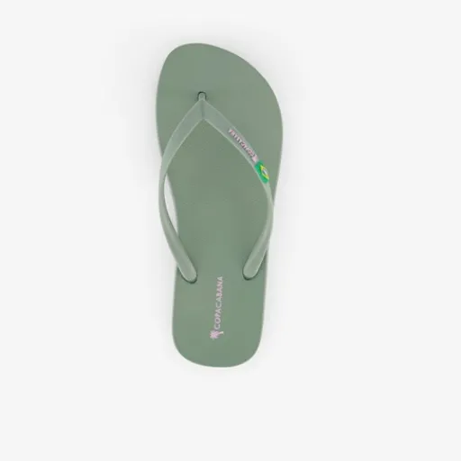 Groene Copacabana teenslippers voor dames. Voorzien van een stevig teenbandje en roze merkopdrukken. De slippers zijn gemaakt van synthetisch materiaal.