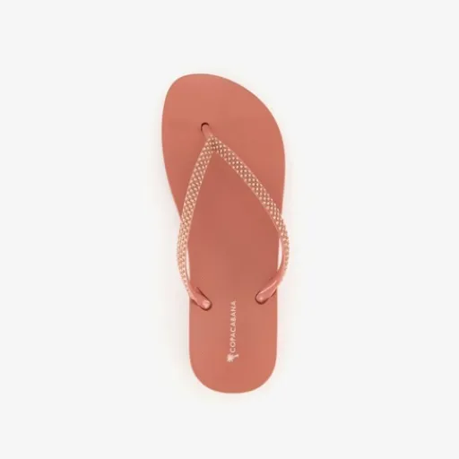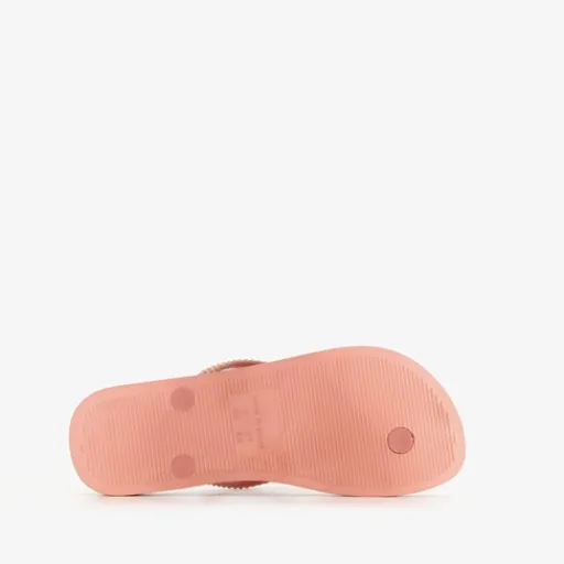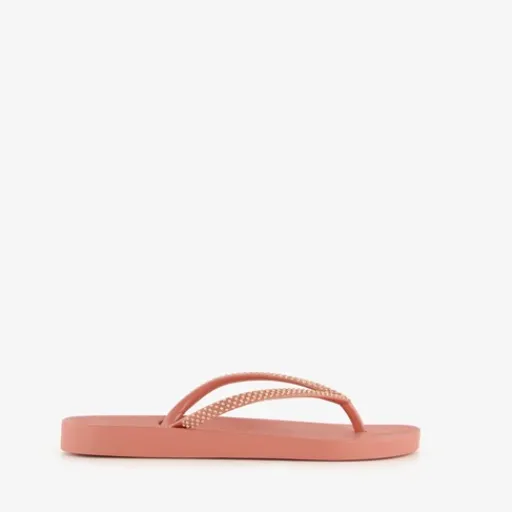 Roze vegan teenslippers voor dames van Copacabana. Voorzien van een teenband met goudkleurige strass steentjes en een comfortabel voetbed. De slippers zijn gemaakt van 100% veganistisch materiaal.