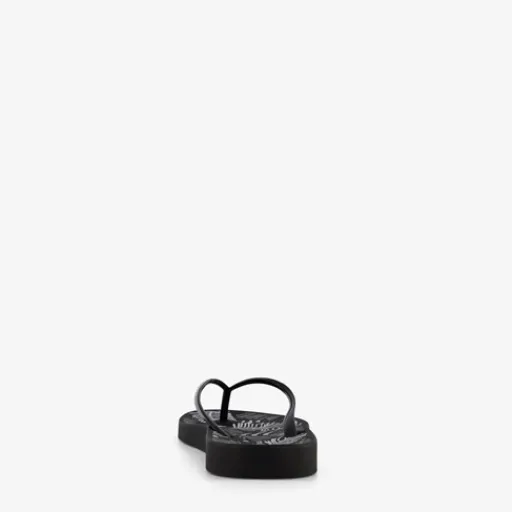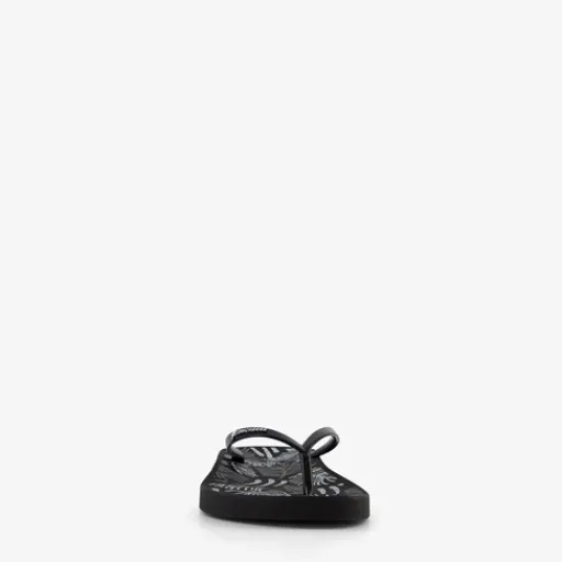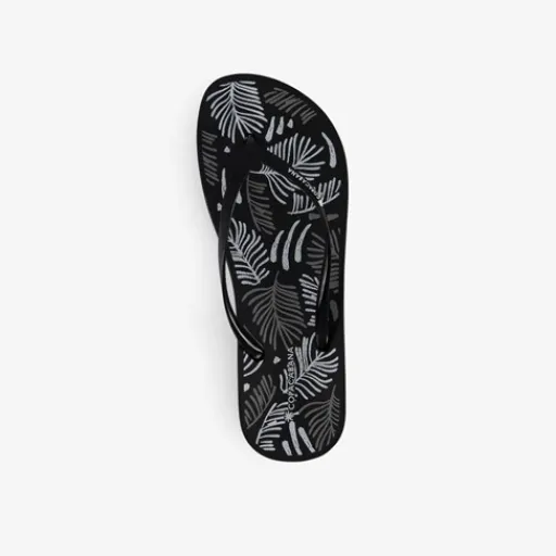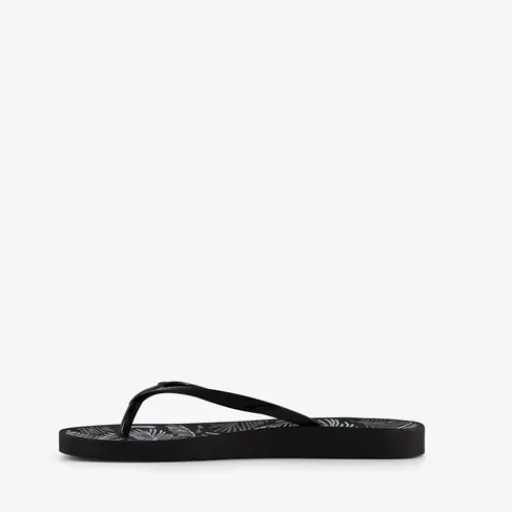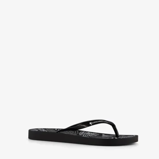 Zwarte Copacabana teenslippers voor dames. Voorzien van een stevige teenband en een comfortbal voetbed met Soft Foam. De slippers hebben een blaadjesprint op de binnenzool en zijn voorzien van een merkopdruk op de teenband. Gemaakt van rubber.