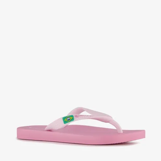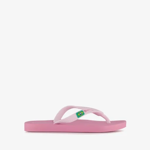 Roze vegan teenslippers voor meisjes uit de Copacabana collectie. Voorzien van een lichtroze teenbandje met een merklogo en een comfortabel voetbed. De slippers zijn gemaakt van 100% veganistisch materiaal.