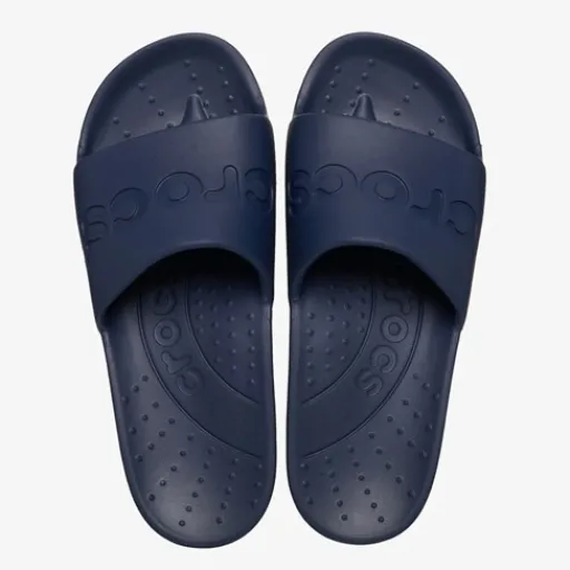 Donkerblauwe Crocs Slide heren badslippers. Voorzien van een Crocs-logo op het gestroomlijnde bovenzijde en volledig gevormd uit Croslite™ voor een lichte en comfortabele feel. De slippers hebben een comfortabele pasvorm. Het Croslite™-materiaal zorgt voor het kenmerkende Crocs comfort.