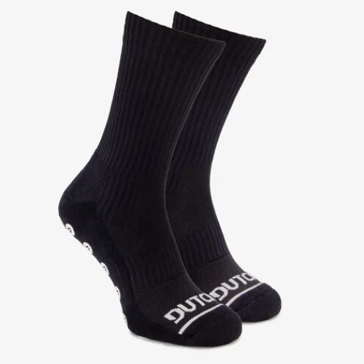 2 paar zwarte, middelhoge gripsokken van Dutchy. Voorzien van antislip inzetten aan de onderkant en witte details. Gemaakt van 98% polyamide en 2% elastaan.