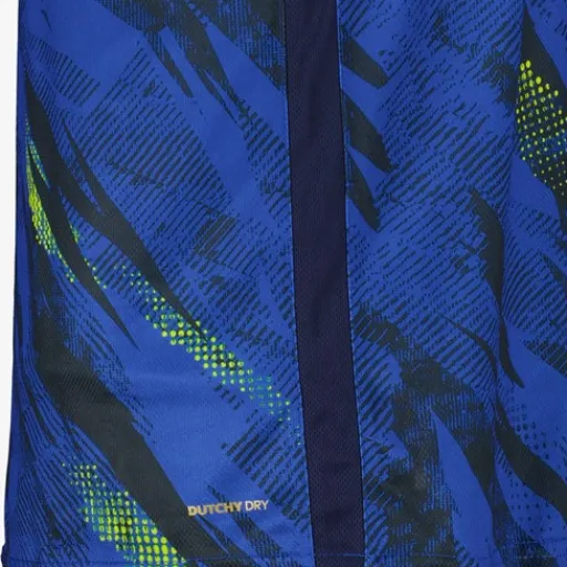Blauw Dutchy Dry voetbal T-shirt voor heren. Voorzien van een kleine V-hals, korte mouwen en grafisch all over print in de kleuren zwart en geel. Het shirt is vervaardigd van sneldrogend materiaal en heeft een comfortabele pasvorm. Zo kan jij je vrij bewegen en blijf je droog tijdens het trainen. Dutchy Dry artikelen zijn lichtgewicht, zweetafvoerend en vochtregulerend. Gemaakt van 100% polyester.