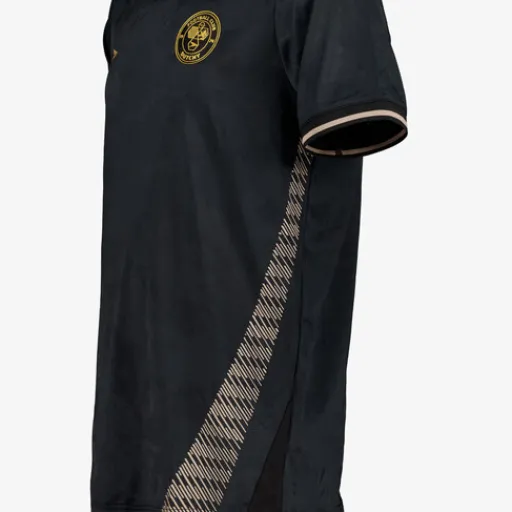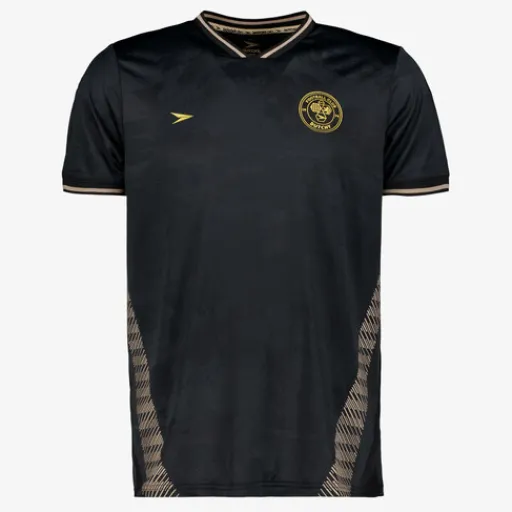 Zwart-beige Dutchy Dry voetbal T-shirt voor heren. Voorzien van een V-hals, merkopdrukken en beige details. Het shirt is vervaardigd van sneldrogend materiaal en heeft een comfortabele pasvorm. Zo kan jij je vrij bewegen en blijf je droog tijdens het trainen. Dutchy Dry artikelen zijn lichtgewicht, zweetafvoerend en vochtregulerend. Gemaakt van 100% polyester.