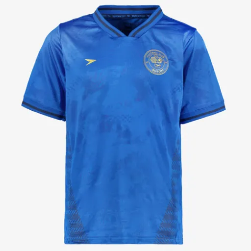 Blauw Dutchy Dry voetbal T-shirt voor kinderen. Voorzien van een V-hals, merkopdrukken en goudkleurige details. Het shirt is vervaardigd van sneldrogend materiaal en heeft een comfortabele pasvorm. Zo kan jij je vrij bewegen en blijf je droog tijdens het trainen. Dutchy Dry artikelen zijn lichtgewicht, zweetafvoerend en vochtregulerend. Gemaakt van 100% polyester.
