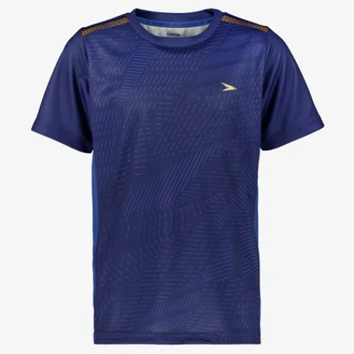 Blauw Dutchy Dry voetbal T-shirt voor jongens. Voorzien van een ronde hals, korte mouwen en een grafische all over print. Het shirt heeft mesh stroken langs de zijkanten die voor ventilatie zorgen. Dutchy Dry artikelen zijn lichtgewicht, zweetafvoerend, vochtregulerend en duurzaam. Gemaakt van 100% polyester.