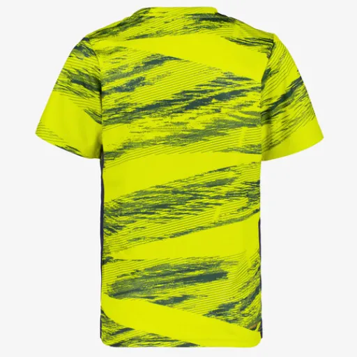Geel-zwart Dutchy Dry voetbal T-shirt voor kinderen. Voorzien van een ronde hals, korte mouwen, een zwarte all over print en een merkopdruk op de borst. Het shirt is vervaardigd van sneldrogend materiaal en heeft een fijne pasvorm. Zo kan jij je vrij bewegen tijdens het trainen en blijf je droog. Dutchy Dry artikelen zijn lichtgewicht, zweetafvoerend, vochtregulerend en duurzaam. Gemaakt van 100% polyester.