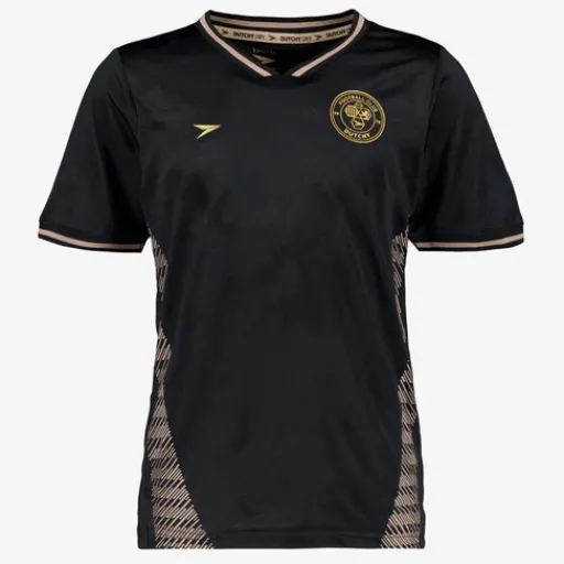 Zwart-beige Dutchy Dry voetbal T-shirt voor kinderen. Voorzien van een V-hals, merkopdrukken en beige details. Het shirt is vervaardigd van sneldrogend materiaal en heeft een comfortabele pasvorm. Zo kan jij je vrij bewegen en blijf je droog tijdens het trainen. Dutchy Dry artikelen zijn lichtgewicht, zweetafvoerend en vochtregulerend. Gemaakt van 100% polyester.