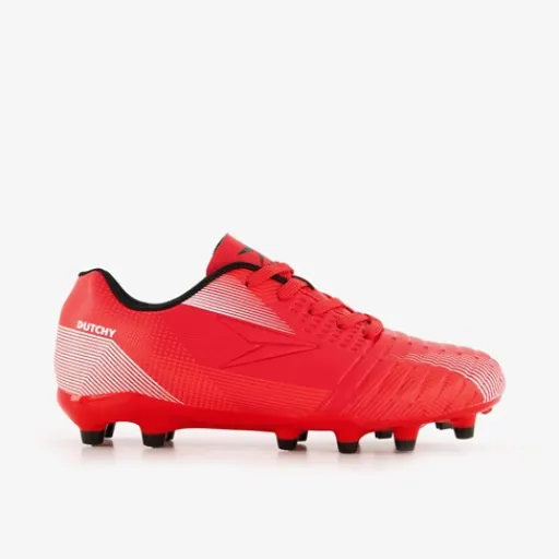 Rode Dutchy FG voetbalschoenen voor kinderen. Gemaakt van imitatieleer met een binnenwerk van textiel en een stevige Firm Ground zool van rubber. De FG zool geeft je veel grip op het veld en is geschikt voor (droog)natuurgras. Het comfortabele voetbed van textiel is uitneembaar zodat je eventueel jouw eigen zolen in de schoenen kan dragen. De schoenen hebben zwarte details en een wit design op het bovenwerk.