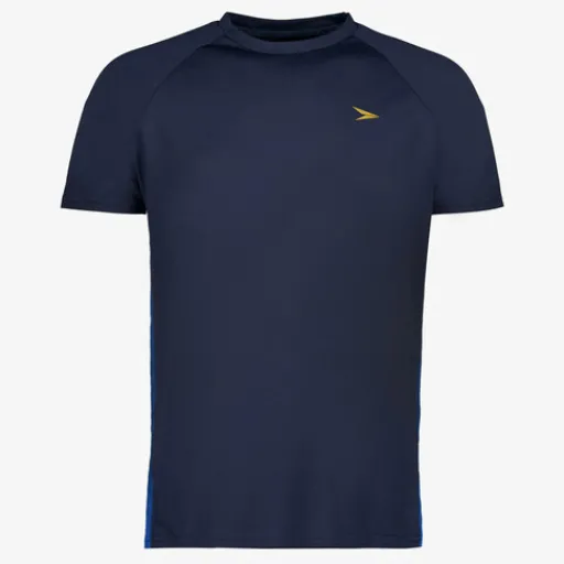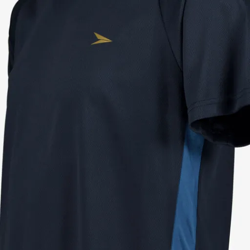 Donkerblauw voetbal T-shirt voor heren van Dutchy. Voorzien van een hoge, ronde hals en korte mouwen. Het shirt heeft een fijne pasvorm, blauwe strepen aan de zijkanten en een merkopdruk op de borst. Gemaakt van 100% polyester.