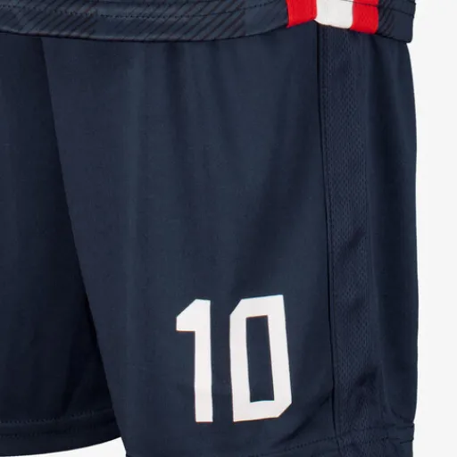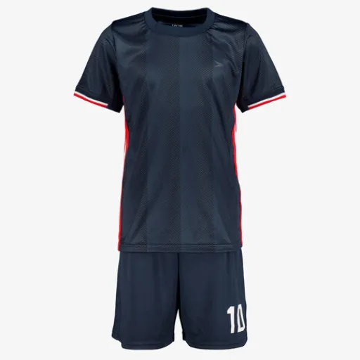 Donkerblauw sport set voor kinderen van Dutchy. Het setje bestaat uit een T-shirt en een short. Het shirt heeft rugnummer 10, een merkopdruk op de borst en rode en witte details. De short heeft een elastische tailleband en nummer 10 op de bovenbeen. Gemaakt van 100% polyester.