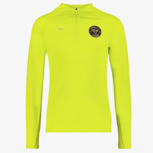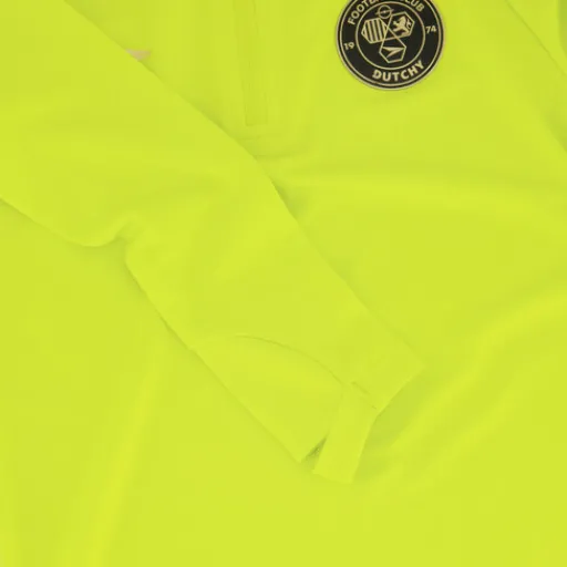 Gele voetbal pully voor kinderen van Dutchy. Voorzien van een kraagje met een korte rits en lange mouwen. De pully heeft een ronde embleem op de arm en een logo opdruk op de borst. Gemaakt van 91% polyester en 9% elastaan.