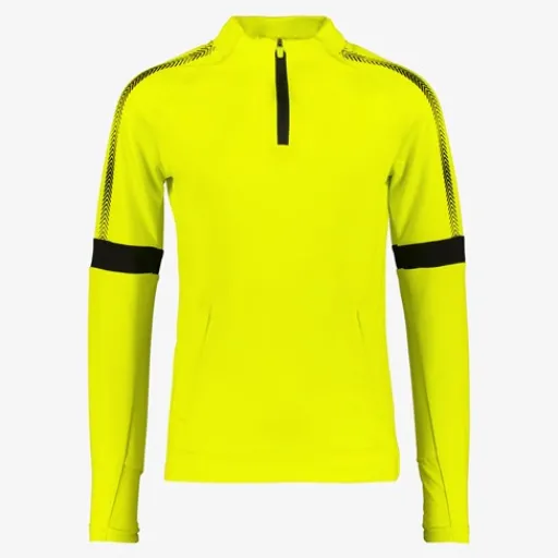 Gele voetbal pully voor jongens van Dutchy. Voorzien van een kraagje met een korte rits, lange mouwen met duimgaten en twee steekzakken met ritsen. De rits bij de kraag heeft een kinbescherming. De pully is vervaardigd van elastisch materiaal wat extra comfort biedt. Gemaakt van 91% polyester en 9% elastaan.