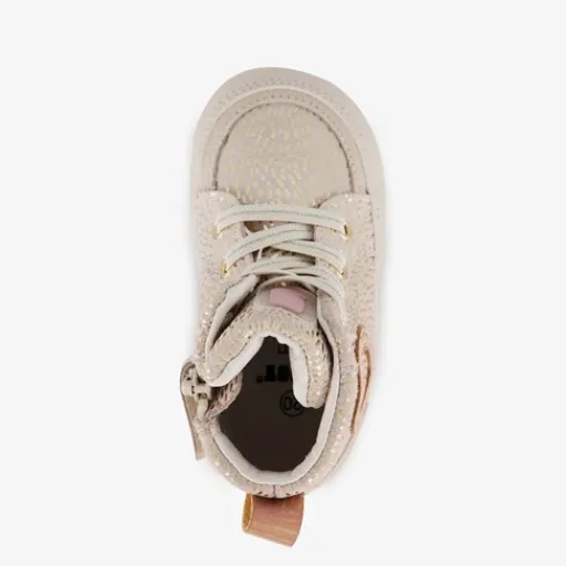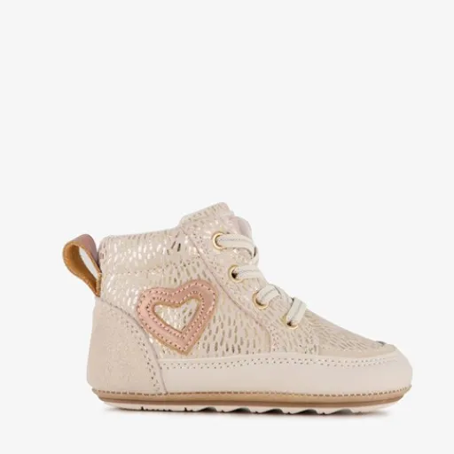 Beige babyschoenen voor meisjes van Groot. Het buiten- en binnenwerk zijn gemaakt van leer en de stevige profielzool is van rubber. Voorzien van elastische veters en een rits aan de binnenzijde voor een goede pasvorm en hiellusjes die het makkelijke maken om de schoenen bij je kindje aan te trekken. Het buitenwerk van de schoentjes wordt versierd met een goudkleurig all over print en aan de buitenzijde is een roze hartje aangebracht. Het comfortabele voetbed van textiel is uitneembaar.
