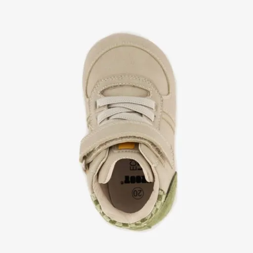 Beige babyschoenen met groene details van Groot. Gemaakt van leer met een flexibele profielzool van imitatieleer. De schoentjes hebben elastische veters en een klittenbandsluiting voor een optimale pasvorm. Het comfortabele voetbed van leer is uitneembaar.