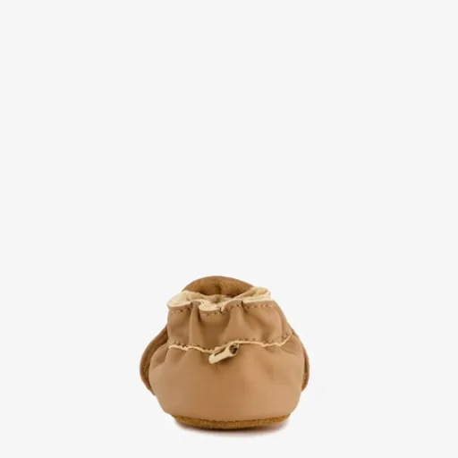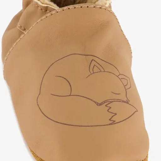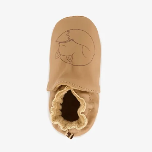 Cognackleurige babyschoenen met een opdruk van een slapend vosje. Gemaakt van leer met een flexibele, soepel buitenzool. De schoentjes hebben een zachte voering en elastische inzetten bij de instap. Hierdoor trek jij de schoenen makkelijk aan bij je kind. Het comfortabel voetbed van textiel is niet uitneembaar.