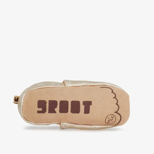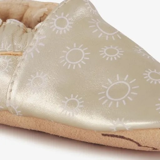 Goudkleurige babyschoenen met opdrukken van zonnetjes. Gemaakt van leer met een flexibele, soepel buitenzool. Deze schattige babyschoentjes hebben een heerlijke zachte voering en zijn voorzien van elastische inzetten bij de instap. Hierdoor trek jij de schoenen makkelijk aan bij je kind. Het comfortabel voetbed van textiel is niet uitneembaar.
