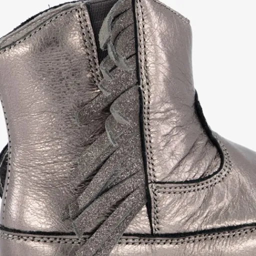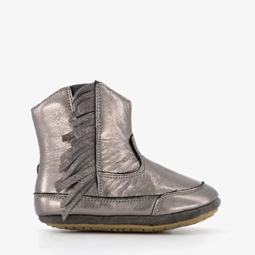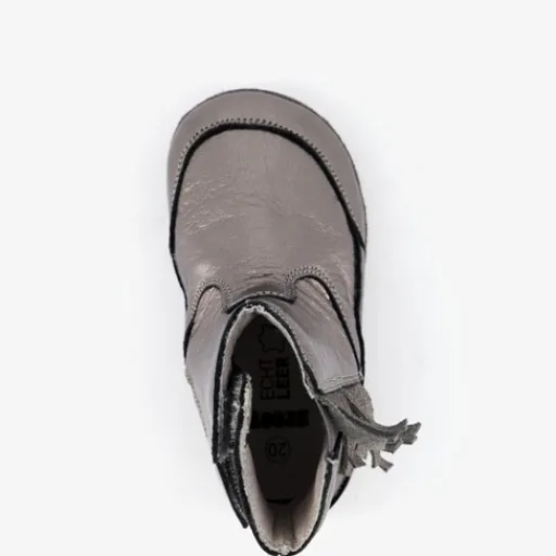 Metallic grijze babyschoenen van Groot. Gemaakt van leer, een binnenwerk van leer en een flexibele, soepele zool. De schoentjes hebben een klittenbandsluiting voor een goede pasvorm, en hierdoor trek je de schoenen makkelijk aan bij je kindje. Aan de zijkanten zijn speelse franjes aangebracht. De zachte, comfortabele babyschoentjes zijn volledig gemaakt van leer die de voetjes laat ademen, en goed beschermen tijdens het kruipen en de eerste stapjes binnenshuis. Voorzien van een uitneembare binnenzool van leer.