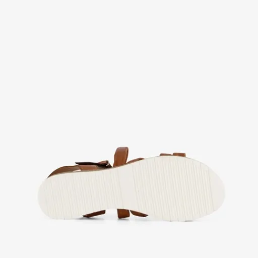 Cognackleurige sandalen voor dames van Harper. Gemaakt van leer en met een witte buitenzool van rubber. Voorzien van meerdere bandjes over de wreef en een klittenbandsluiting bij de enkel. De sandalen hebben een comfortabele binnenzool van leer. Deze is niet uitneembaar.