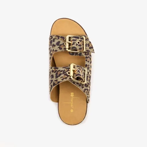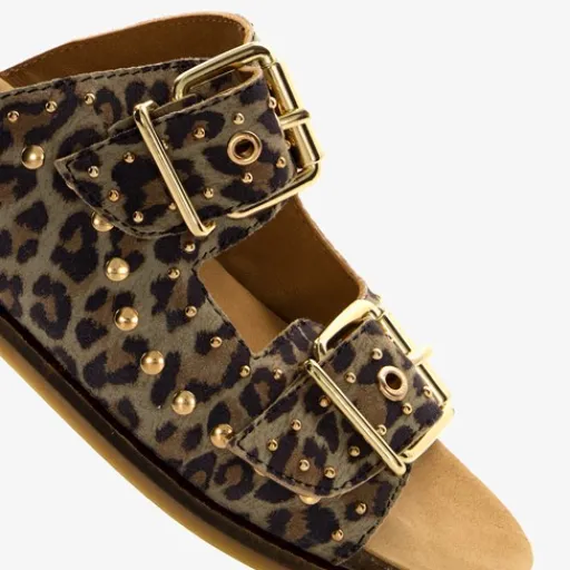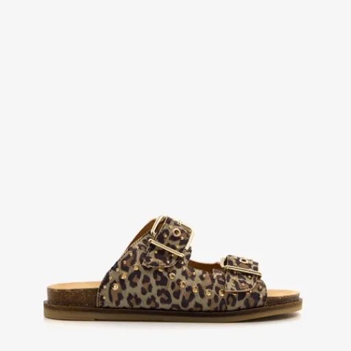 Bruine Harper slippers met panterprint en goudkleurige studs voor dames. Gemaakt van suede met stevige buitenzool. Voorzien van twee brede banden met gespsluiting over de wreef. Het comfortabele voetbed is gemaakt van leer en is niet uitneembaar.