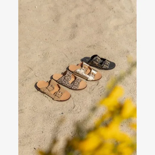 Goudkleurige slippers met studs voor dames uit de Harper collectie. Gemaakt van leer met stevige buitenzool. Voorzien van twee brede banden met gespsluiting over de wreef. Het comfortabele voetbed is gemaakt van leer en is niet uitneembaar.
