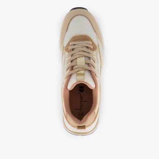 Beige sneakers voor dames uit de Harper collectie. Het bovenwerk is gemaakt van suède en leer, het binnenwerk van textiel en de stevige zool met profiel is van rubber. Voorzien van een vetersluiting en aantreklusjes op de hiel en tong voor een makkelijke instap. Het comfortabele voetbed van leer is uitneembaar. De sneakers hebben goudkleurige details en een zwarte buitenzool.