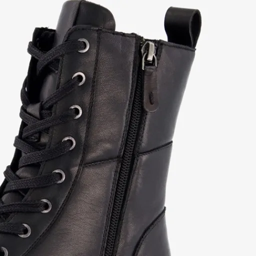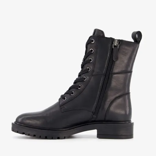 Zwarte veterboots voor dames uit de Harper collectie. Het buiten- en binnenwerk zijn gemaakt van leer en de stevige zool met profiel van rubber. Voorzien van een veter- en ritssluiting en hiellusjes. Deze stoere dames boots hebben een comfortabele binnenzool van leer. Schachthoogte is 17 cm en hakhoogte is circa 2 cm. Binnenzool is niet uitneembaar.