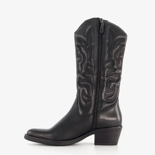 Zwarte western laarzen voor dames van Harper. Gemaakt van leer, een binnenwerk van leer en een stevige zool. De cowboylaarzen hebben een ritssluiting aan de binnenzijde en een comfortabel voetbed van leer. Deze is niet uitneembaar. De schachthoogte bedraagt 30 cm. De zwarte cowboylaarzen hebben een blokhak van circa 2,5 cm.