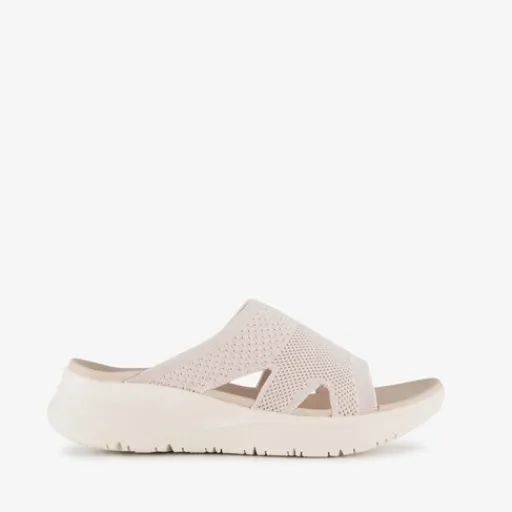 Beige slippers voor dames van Hush Puppies. Het bovenwerk is gemaakt van textiel en de stevige profielzool is van rubber. De slippers hebben een brede band over de wreef en een sleehak. De sleehak is circa 5 cm hoog.