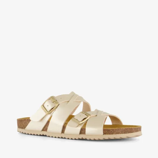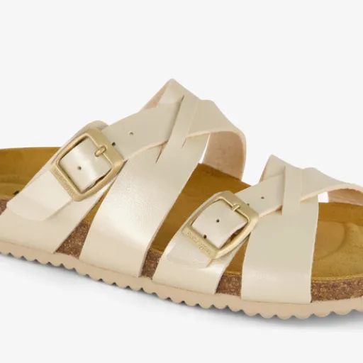 Parelmoerkleurige bio slippers van Hush Puppies. Het buitenwerk is gemaakt van imitatieleer, het binnenwerk van leer en de stevige zool met profiel is van rubber. De slippers hebben wreefbandjes met gespsluiting en een zachte voetbed van leer. Deze is niet uitneembaar.