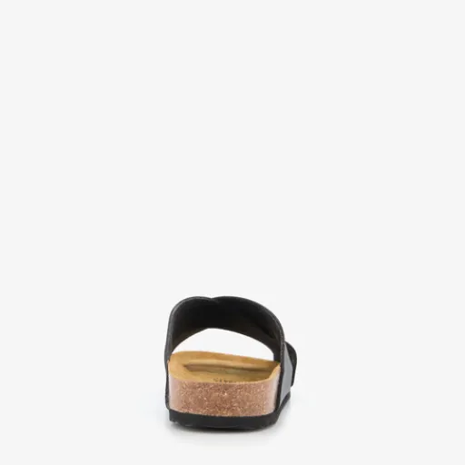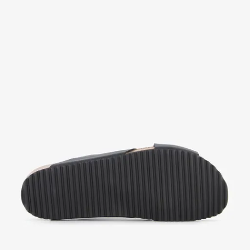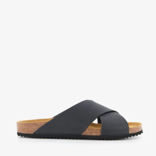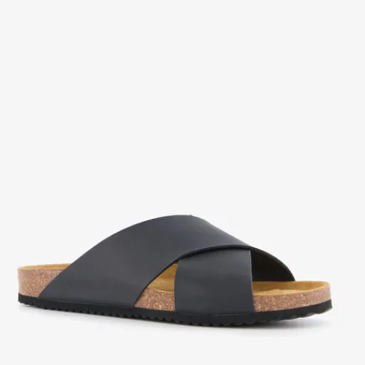 Zwarte slippers voor heren van Hush Puppies. Het bovenwerk is van imitatieleer, het binnenwerk van leer en de stevige zool met profiel is van rubber. Voorzie van brede cross-over bandjes op de wreef en een comfortabele binnenzool van leer. Deze is niet uitneembaar.