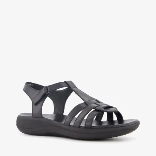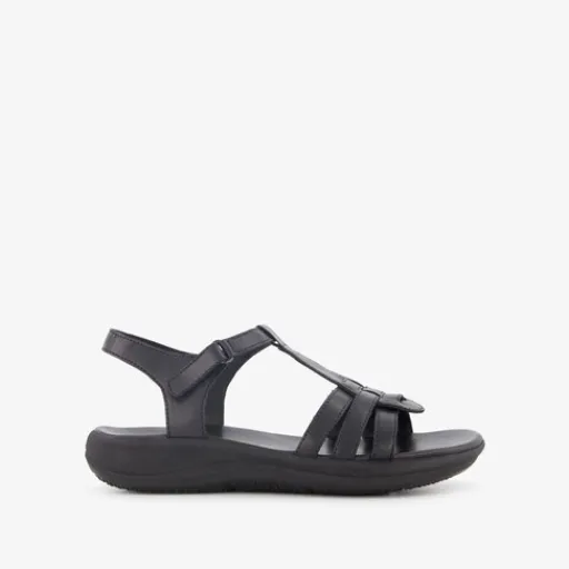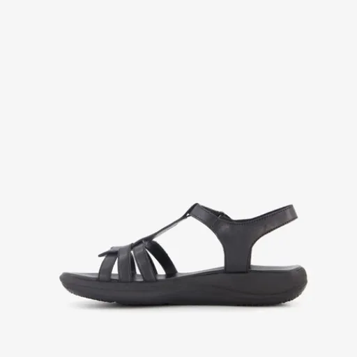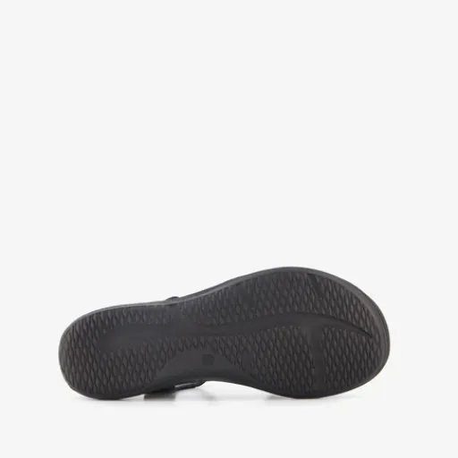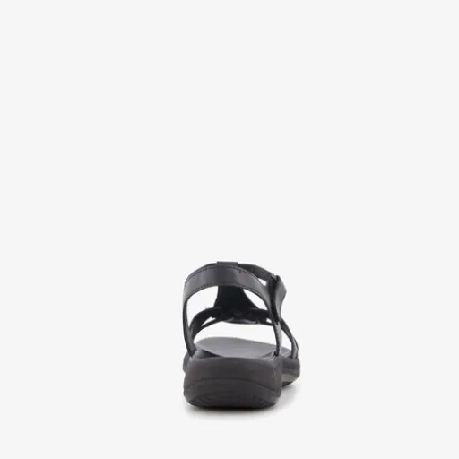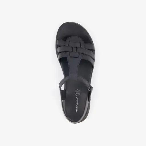 Zwarte sandalen voor dames van Hush Puppies. Voorzien van meerdere bandjes over de tenen en een enkelbandje met klittenbandsluiting. De sandalen zijn gemaakt van leer en hebben een profielzool van rubber. Het comfortabele voetbed van leer is niet uitneembaar.